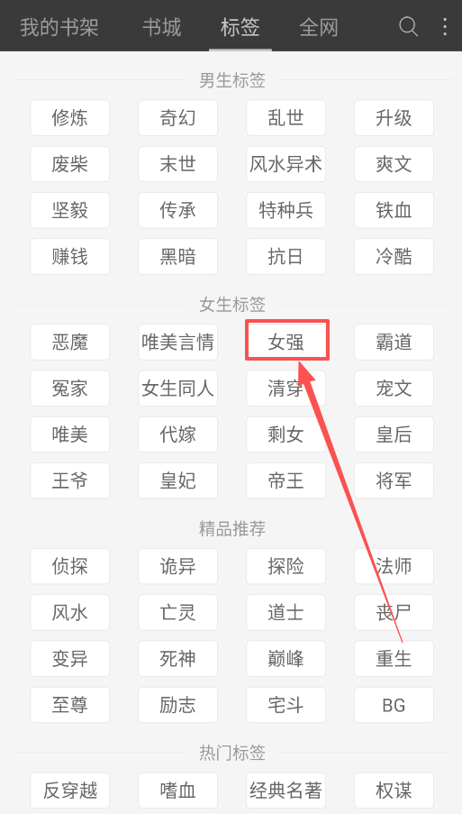2、标签页提供大量关键词,如“末世”“女强”“诡异”等,点击即可过滤对应作品,适合偏好明确的用户。