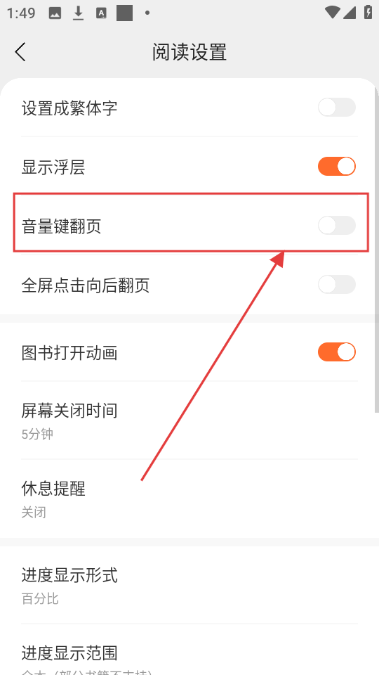 4、在阅读设置页面,可开启【音量键翻页】功能,让阅读翻页更便捷哦。