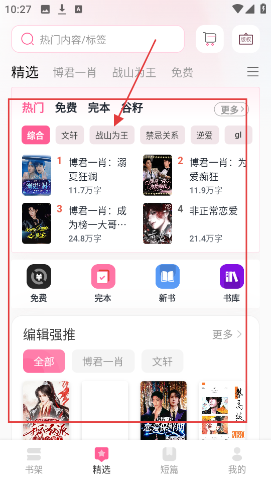 1、在精选页面选喜欢的标签,比如【战山为王】,就能找到相关小说,快去看看吧。