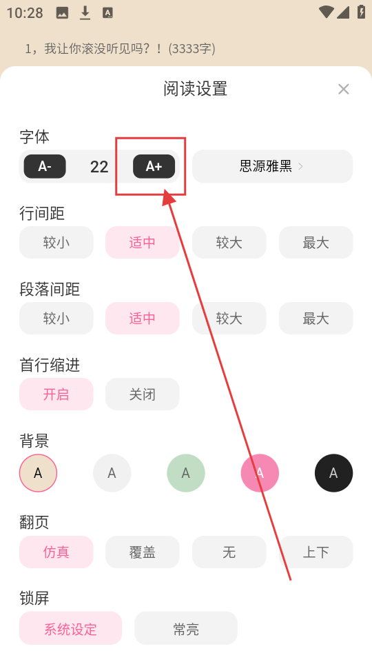 4、阅读设置里点【A+】,可以放大字体,方便阅读,是不是很贴心呀。