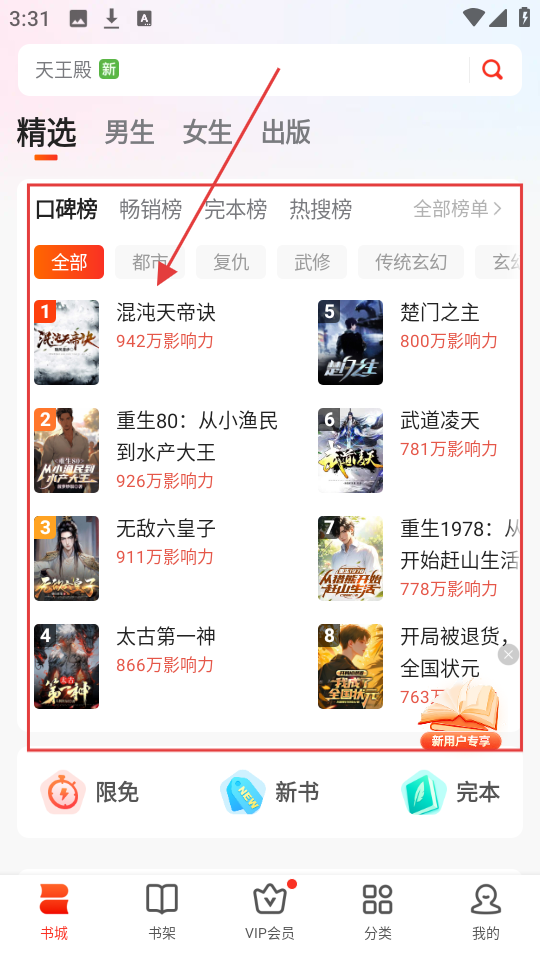 1、我们进入软件,能看到各类榜单的小说,若对某本小说感兴趣,点击小说封面或标题。