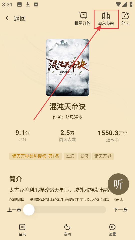2、进入小说详情页,能看到评分、简介等信息,若要收藏小说,点击【加入书架】哦。