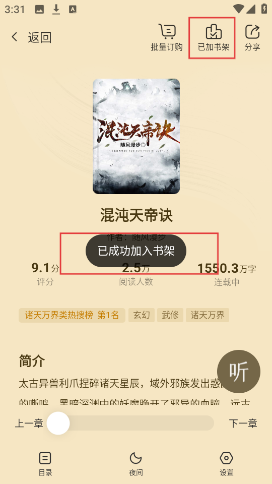 3、点击后,页面会提示已成功加入书架,小说就被收藏好啦。