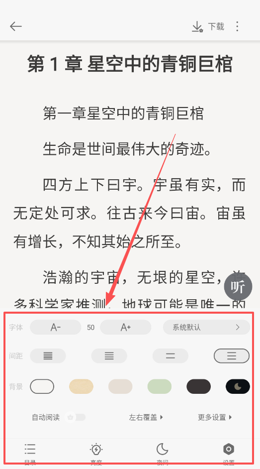 4、阅读设置选项允许用户自由调整界面背景和字体样式,打造最符合个人喜好的阅读环境,让您畅享无阻阅读乐趣。