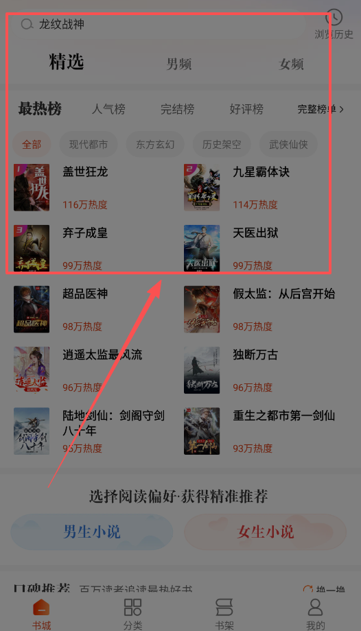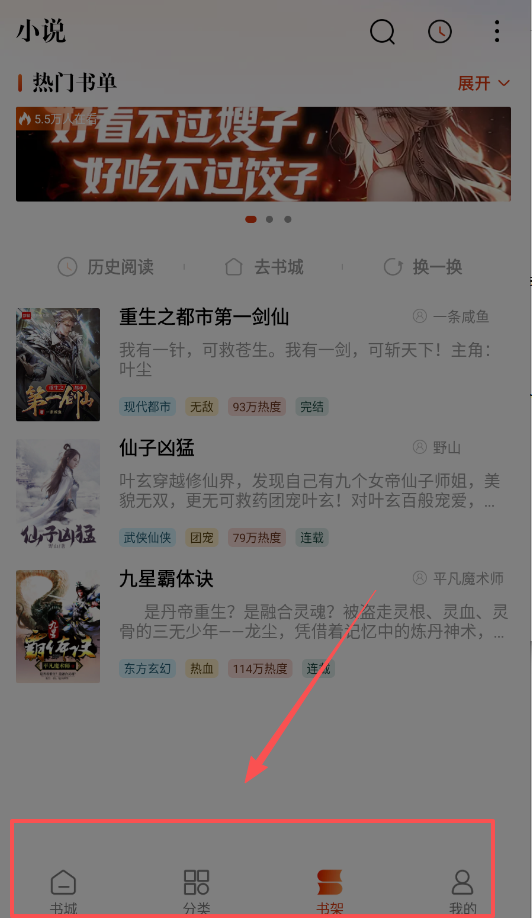 4、最后在小说页还能查看历史阅读记录,热门书单比如重生之都市第一剑仙、仙子凶猛,点开就能直接继续阅读啦。