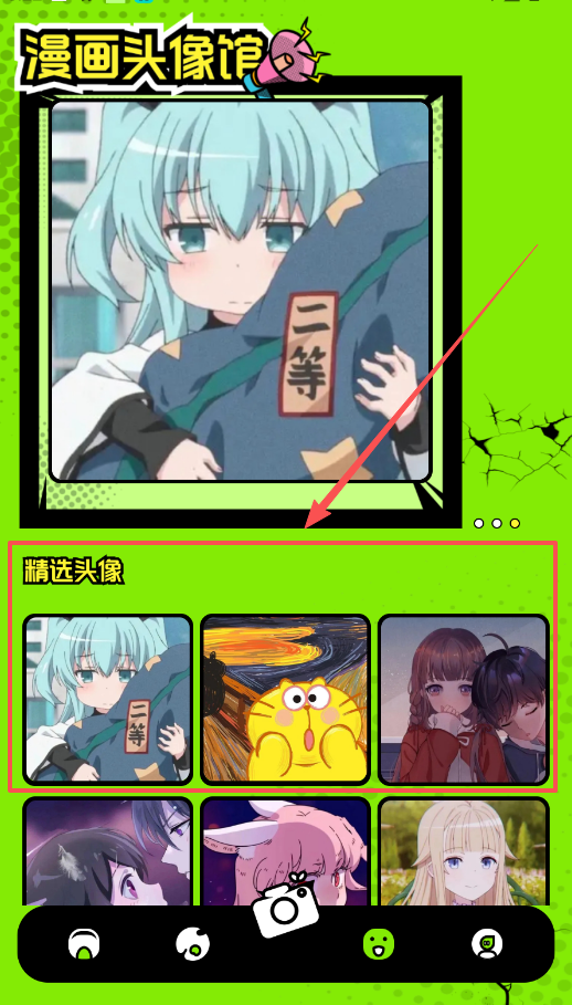 1、启动应用后,直接点击“漫画头像”或“精选头像”按钮。你会进入一个素材库,里面有很多分类好的头像模板。