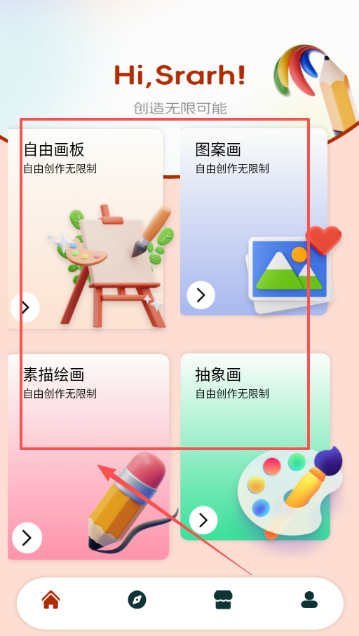 2、深入了解四大画板的功能特点,自由画板提供最大创作自由度,图案画侧重重复元素,素描绘画强调线条表现。