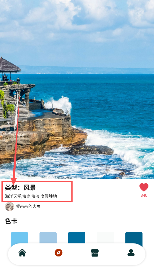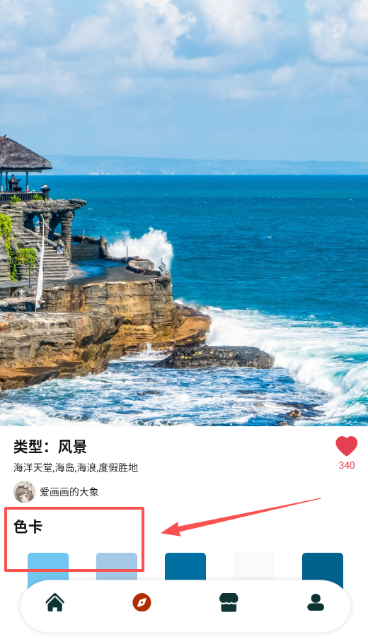 1、灵感应用的技巧是先明确想画的内容类型,然后到灵感集市中寻找对应标签下的作品参考,比如风景类的“海岛”主题。