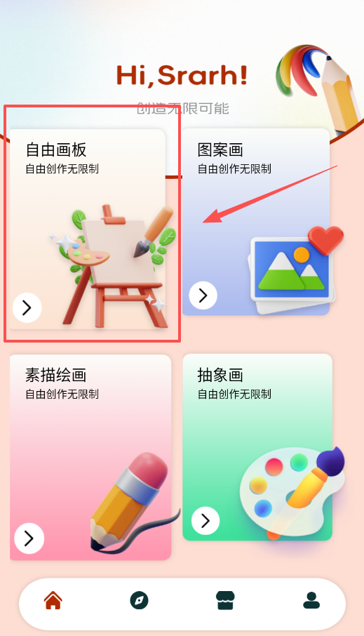 2、根据创作需求选择画板工具,自由画板适合综合创作,图案画适合装饰性绘画,可按需切换不同画板尝试效果。