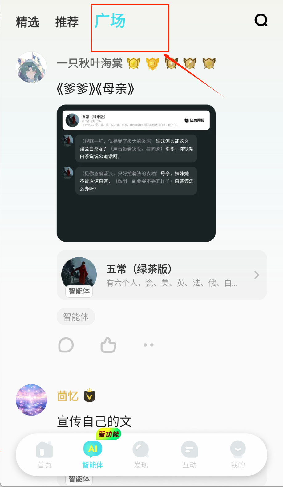 1、点击底部互动按钮进入广场页面,这里展示精选推荐和用户分享的动态,包括智能体互动和创作心得等各种内容。