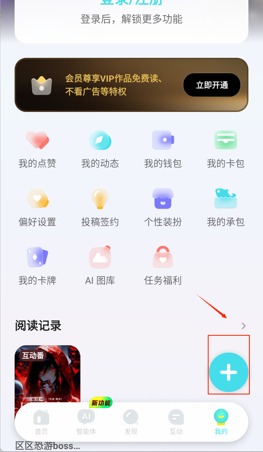1、在我的页面点击创作中心,选择新建作品开始编写,使用对话体格式设计角色和剧情发展。