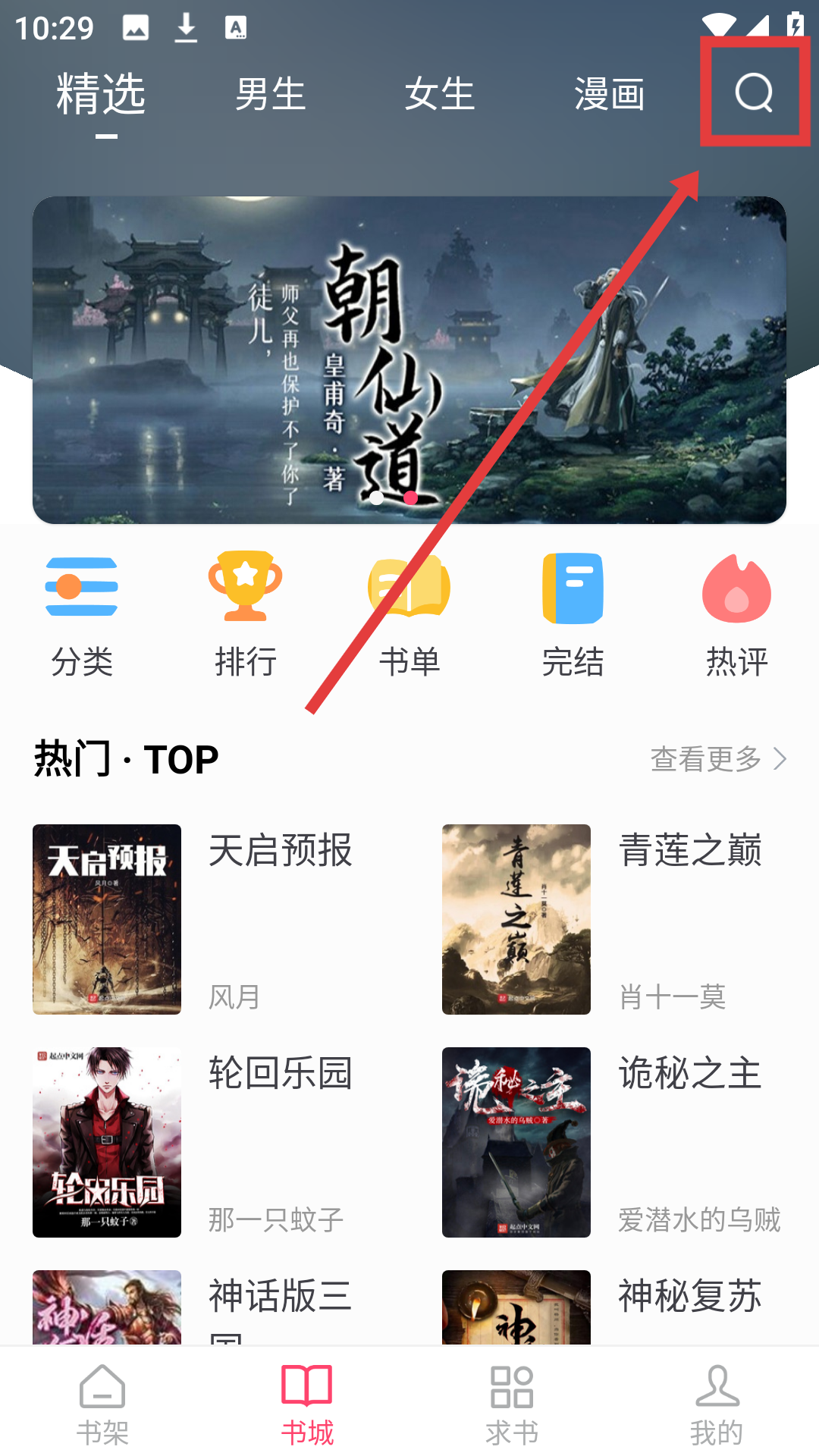 1、在书城页面点击右上角搜索按钮,进入搜索页面可查找喜欢的小说哦。
