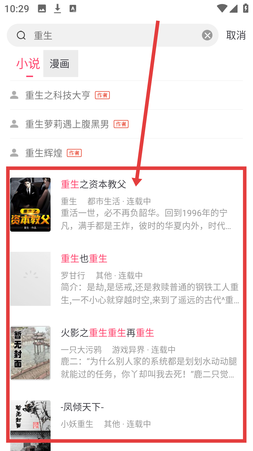 3、在搜索结果中挑选喜欢的小说,比如《重生之资本教父》,点击进入详情页哦。