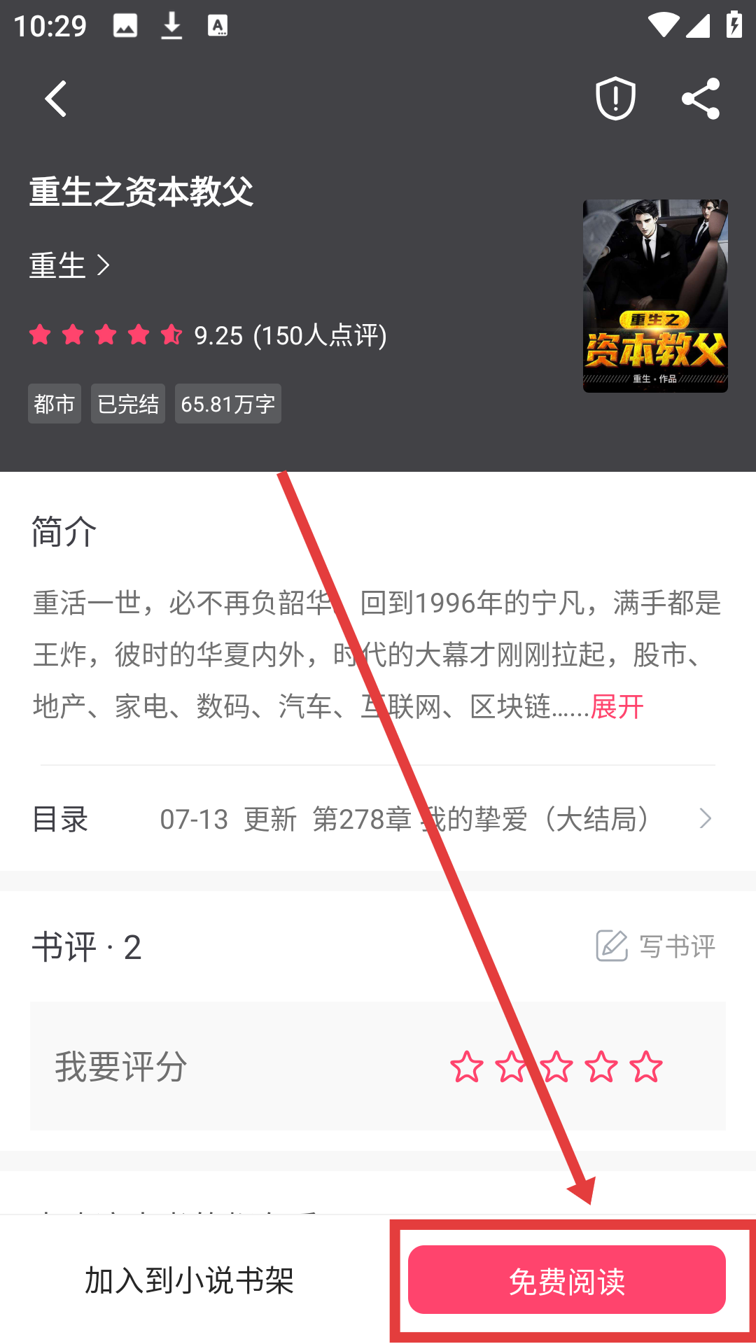 4、进入小说详情页后,点击【免费阅读】按钮,即可开始阅读小说内容啦。