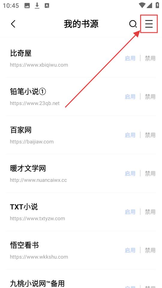 2、进入【我的书源】后,点右上角【三条杠-图标】,能找到更多书源操作选项哦。