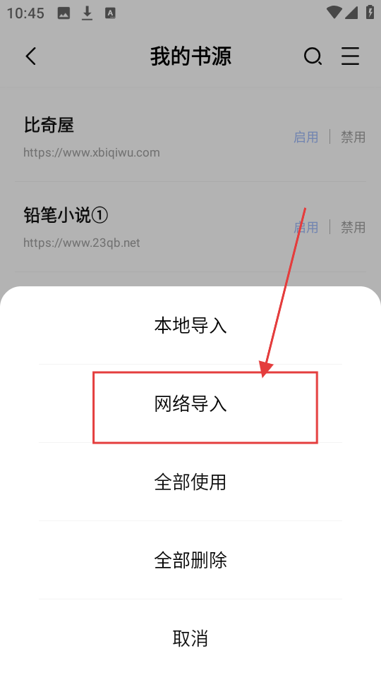 3、想添加新书源,选【网络导入】就行啦,这样能导入网络书源呢。