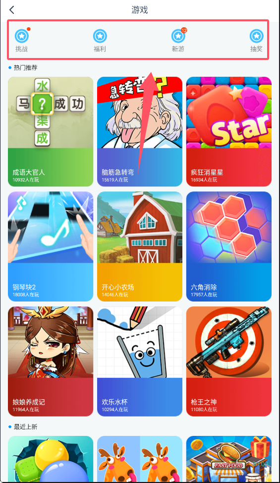2、游戏页面有挑战、福利、新游、抽奖等板块,提供互动娱乐体验。热门推荐显示实时在线人数,可以参考热度选择游戏。