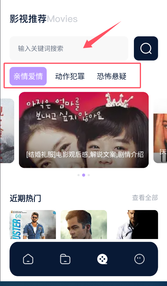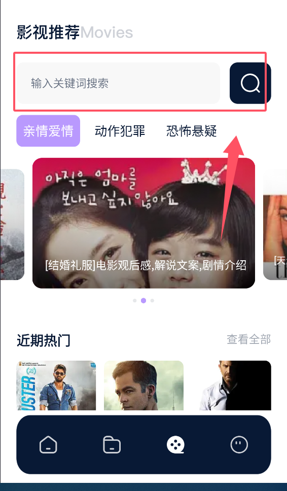 1、打开影视APP后先看顶部搜索栏,输入片名或演员名都能搜。比如输入"动作犯罪"会推荐相关类型影片,右侧搜索图标点一下确认即可。