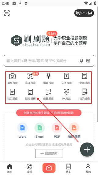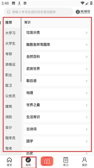 4、点底部的【发现】选项,能进入分类题库页面,查看不同领域的题库资源哦。