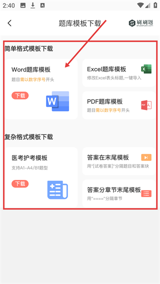 1、在首页,点【题库模板】选项,可进入模板下载页面,获取不同格式的题库模板哦。