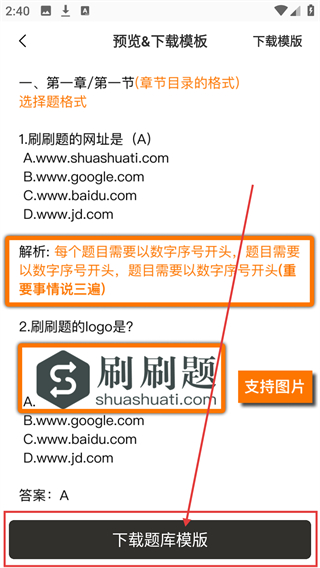 3、在模板预览页,可查看模板格式示例,确认后点【下载题库模版】就能获取模板文件呢。