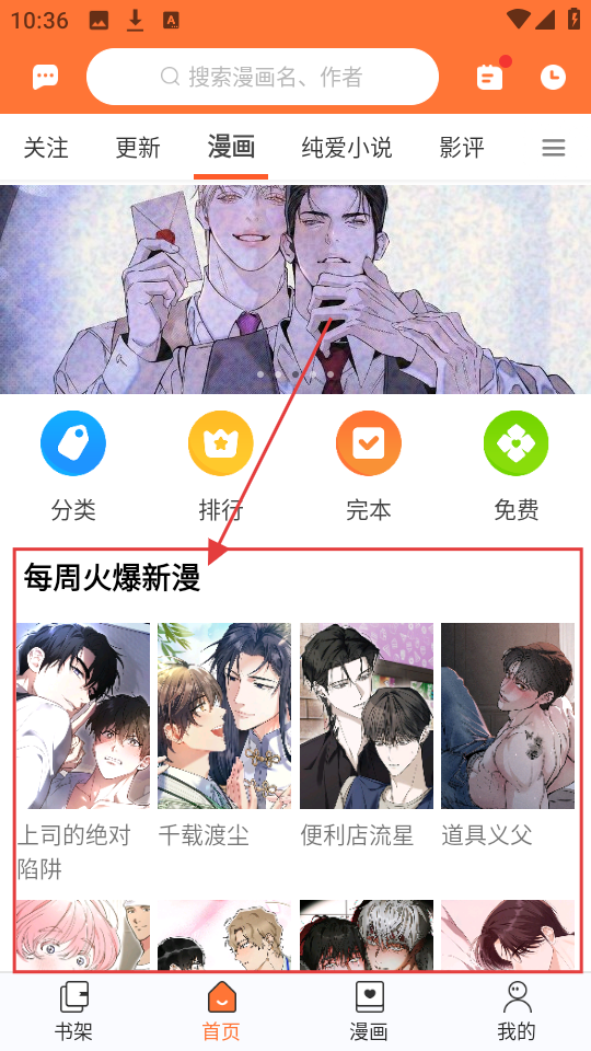 1、在首页的每周火爆新漫里,有【上司的绝对陷阱】等新漫,点击就能进入详情页开始阅读啦。