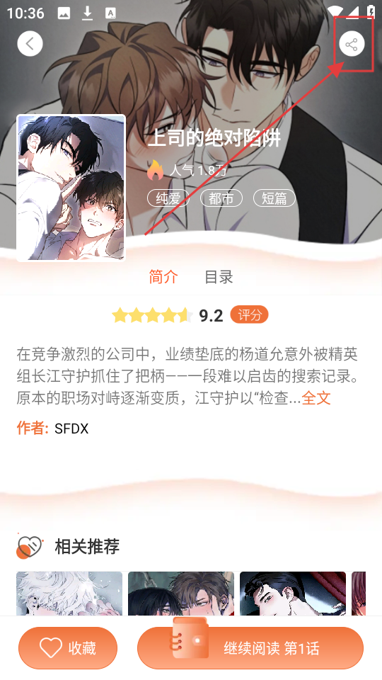 2、进入漫画详情页后,点击右上角的分享图标,就能打开分享选项,快分享给好友吧。