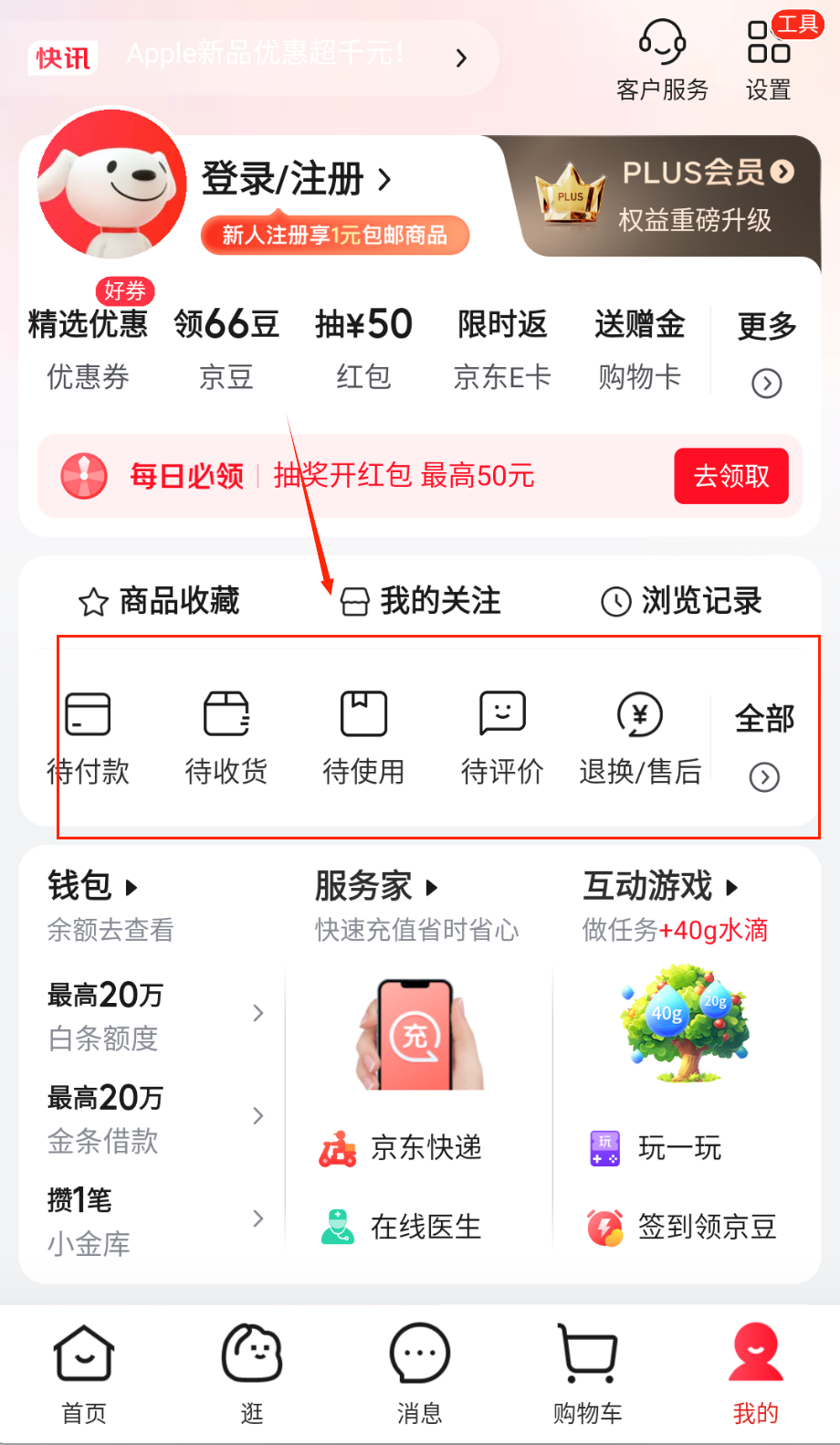 2、登录后可以在“我的”页面查看待付款、待收货等订单状态,还能领取京豆和优惠券,日常签到也能积累积分,方便管理购物记录哦。