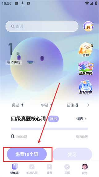 1、在背单词页面点击【来背10个词】按钮,就能进入单词学习界面,开始今日的单词背诵任务啦。