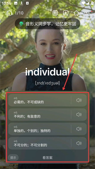 2、在单词学习页看到【individual】这类单词,可选择对应的词义选项,完成单词的认知练习哦。