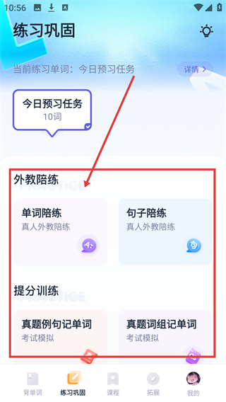 3、在练习巩固页选择【单词陪练】这类功能,能借助外教陪练来强化单词的记忆效果啦。