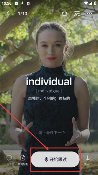 4、在单词学习详情页点击【开始跟读】按钮,可跟随示范发音练习,提升单词的读音掌握度哦。