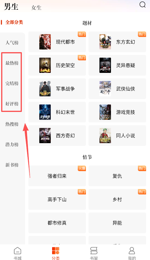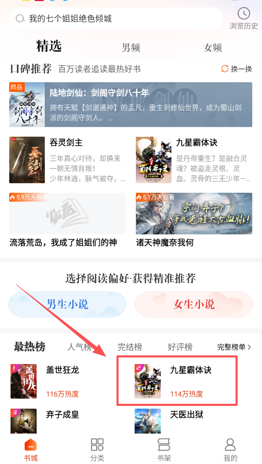 2、寻找更多好书请进入书城界面,你可以选择男生或女生频道,参考热度榜、好评榜等各类排名。