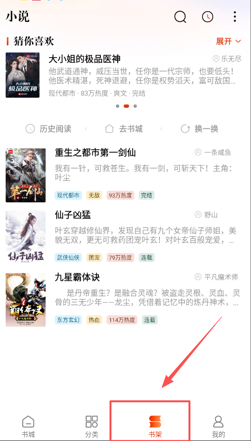4、软件底部四个图标常驻,书架保存你的个人收藏,分类页提供热门书单和智能推荐板块,让你轻松找到下一本想读的小说。