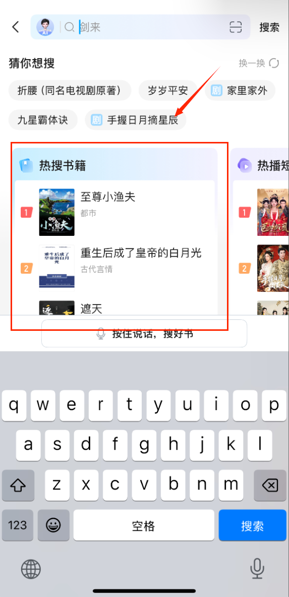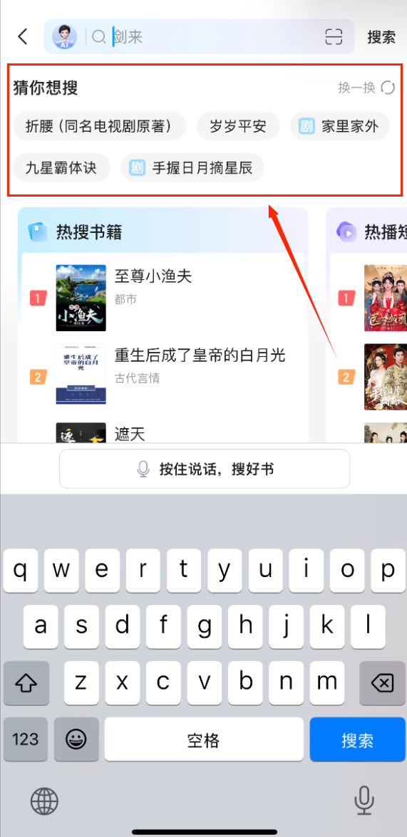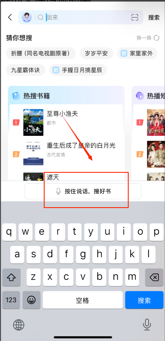 1、搜索框支持语音输入功能,点击麦克风图标直接说出书名,自动识别转换为文字查询。
