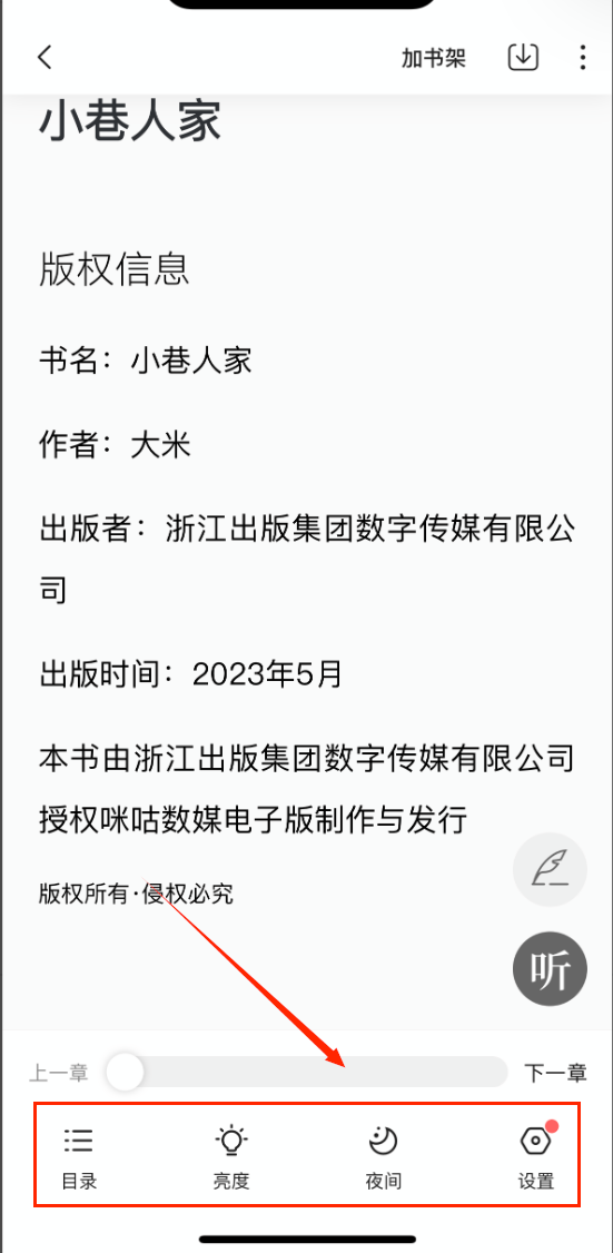 2、所有图书资源均由正版授权,并有全新的夜间皮肤可阅读让你尽情追书。