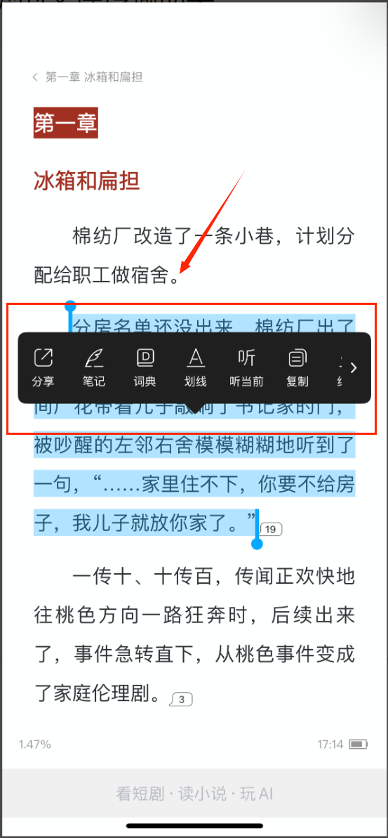 2、长按文本内容弹出菜单选项,支持划线笔记和即时翻译,所有笔记自动同步至云端永久保存。