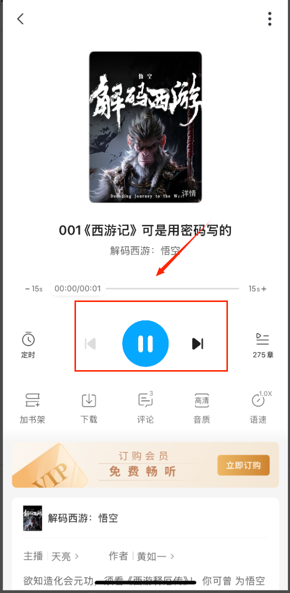 2、选择感兴趣的有声书进入详情页面,试听功能可预览前五分钟内容,喜欢即可点击订阅整部作品。