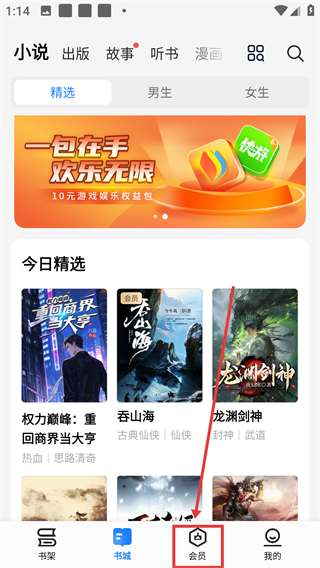 1、在APP的书城页面,点击底部的【会员】选项,可进入会员界面,了解会员权益并准备开通啦。