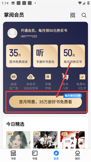 2、进入会员界面后,点击【首月特惠,35万册好书免费看】按钮,可进入会员开通的套餐选择页面哦。