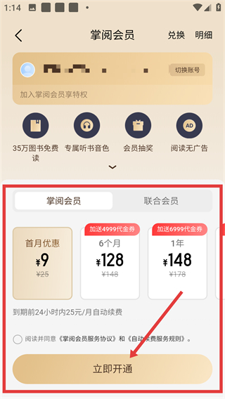 3、在套餐选择页面,选好心仪的会员时长后,勾选协议并点击【立即开通】,进入确认开通的环节啦。