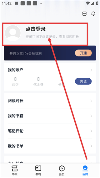 1、在APP的“我的”页面,点击【点击登录】区域,可进入登录界面,登录后能同步阅读记录等信息啦。
