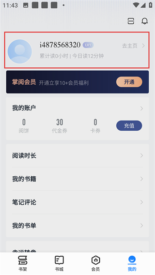 4、登录成功后,“我的”页面会显示账号信息,还能查看阅读时长、我的书籍等内容,功能也会更完善哦。