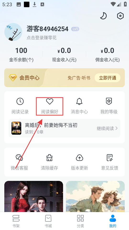 2、进入个人页面后,找到【阅读偏好】选项,点击它可进入阅读偏好设置界面,去选择喜欢的小说类型哦。