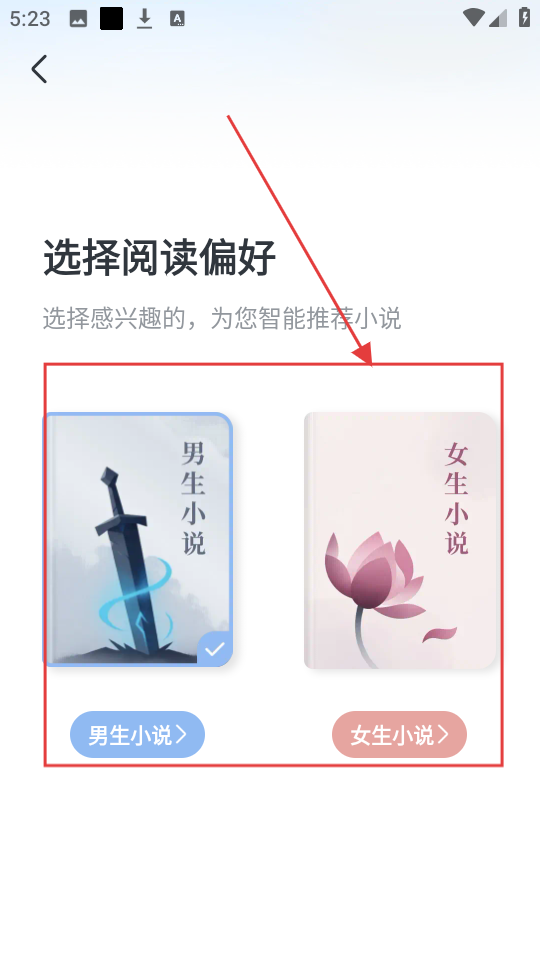 3、在阅读偏好设置界面,有【男生小说】和【女生小说】可选,根据喜好点击对应的选项就行啦。