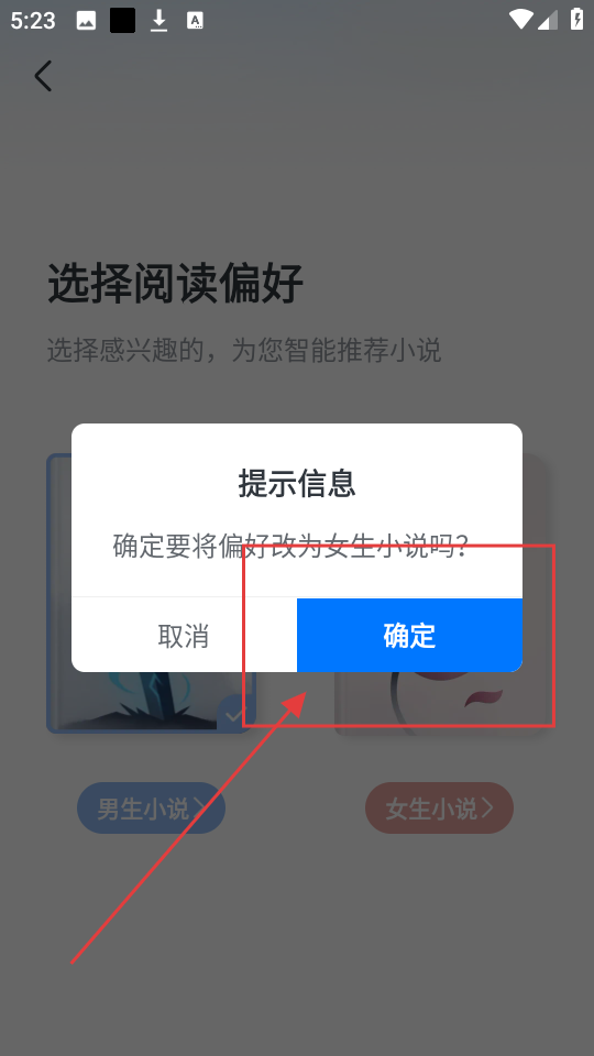 4、选择好后,会弹出提示框询问是否确定更改,点击【确定】按钮,就能成功设置阅读偏好啦。