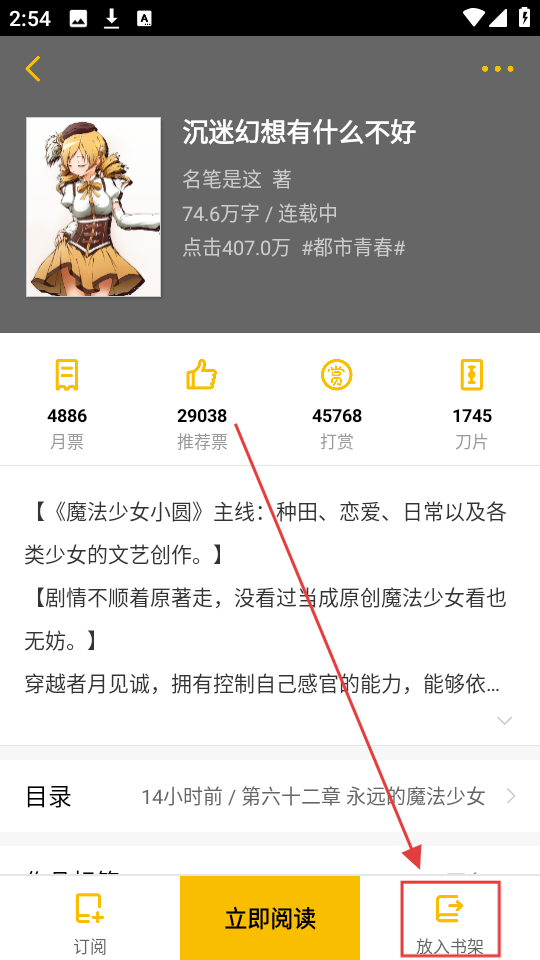 2、进入书籍详情页后,点击【放入书架】,可将该书籍加入书架,方便后续阅读哦。