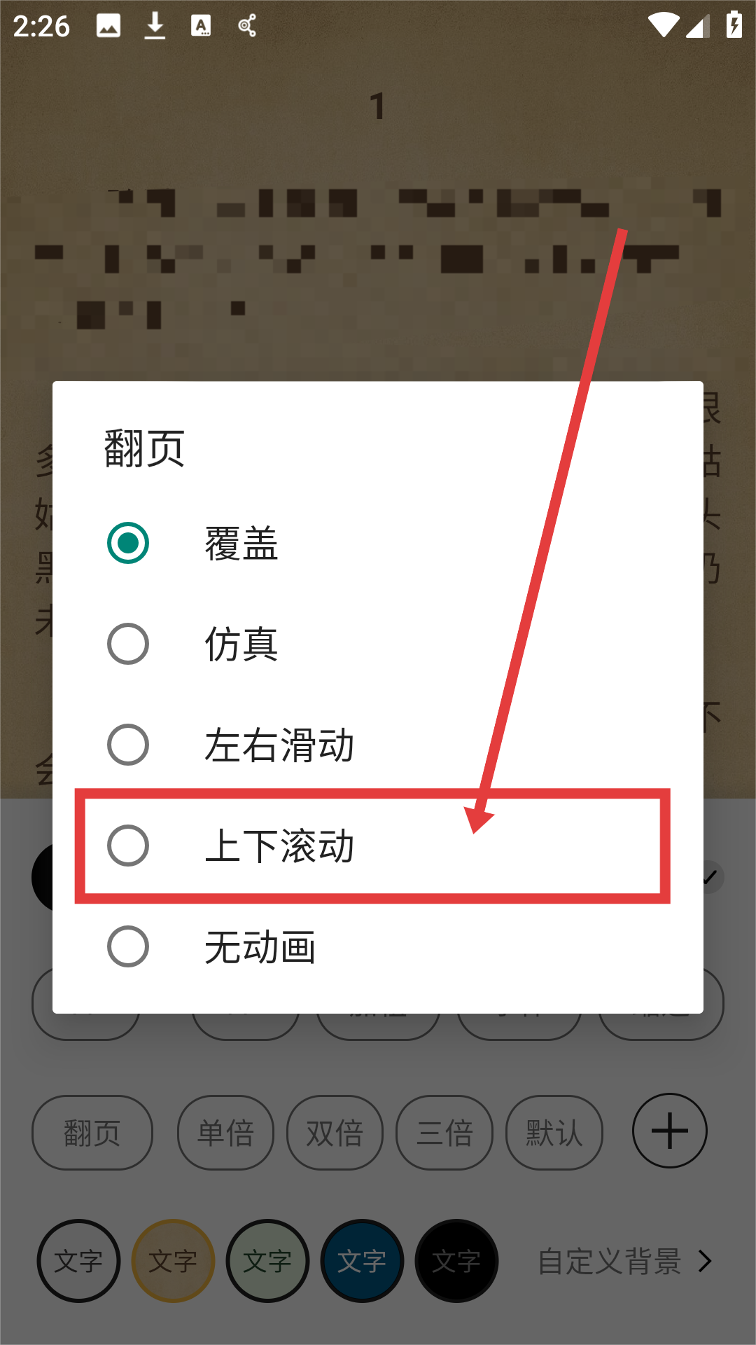 4、在翻页方式选择列表中选择【上下滚动】,即可设置为上下滚动翻页方式啦。