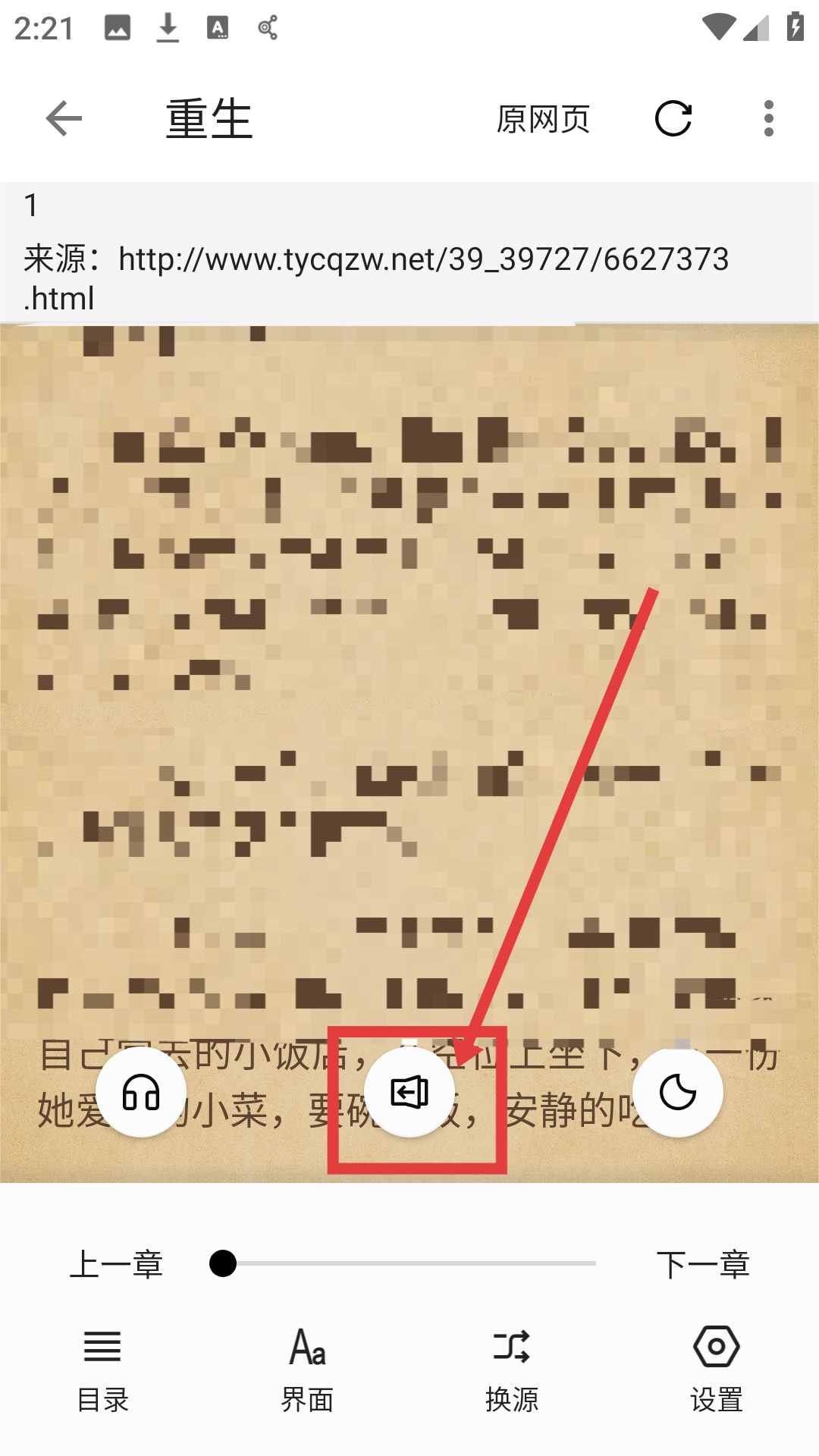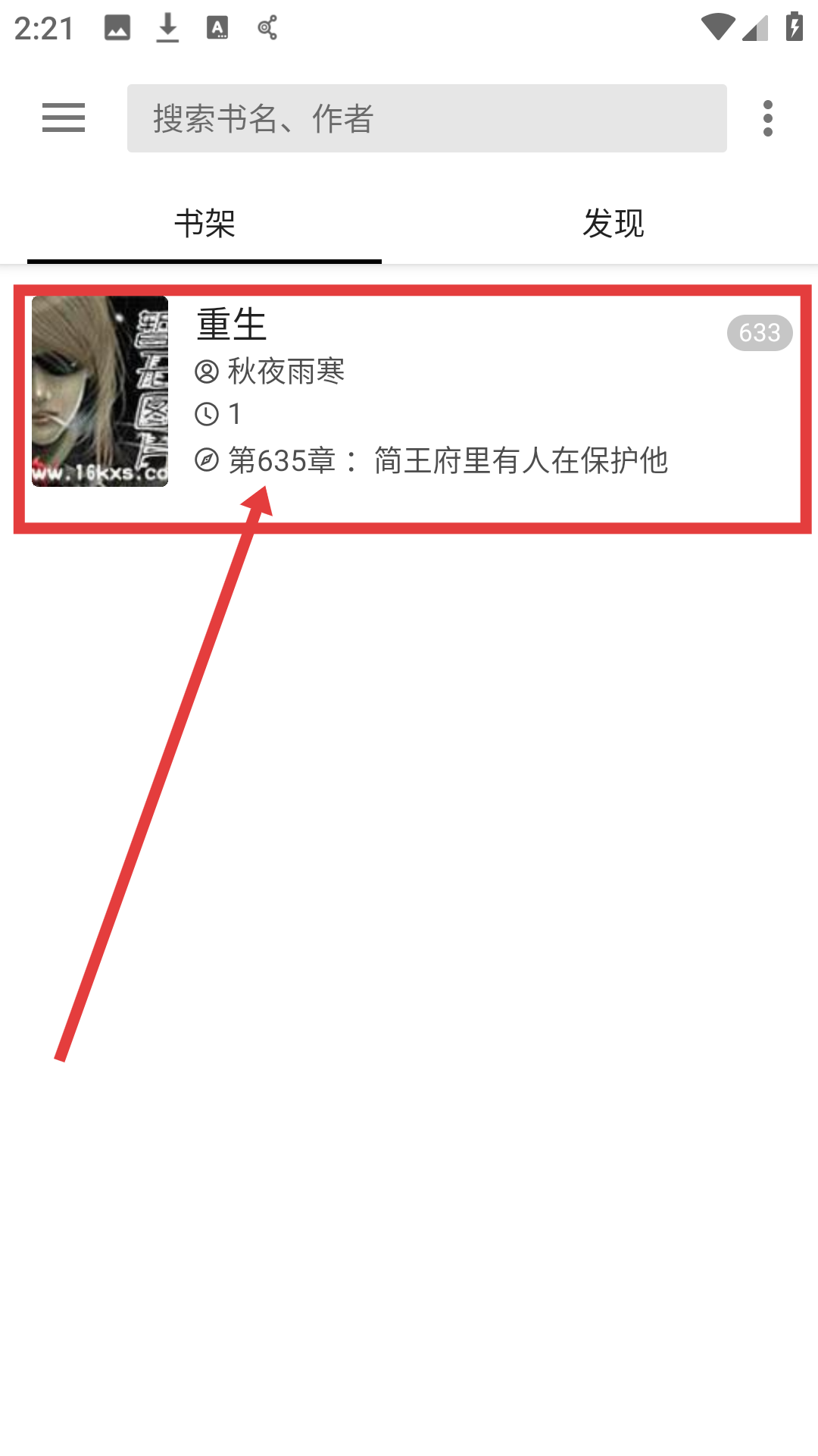 1、在阅读软件书架页面,点击小说《重生》,可进入小说阅读页面啦。
