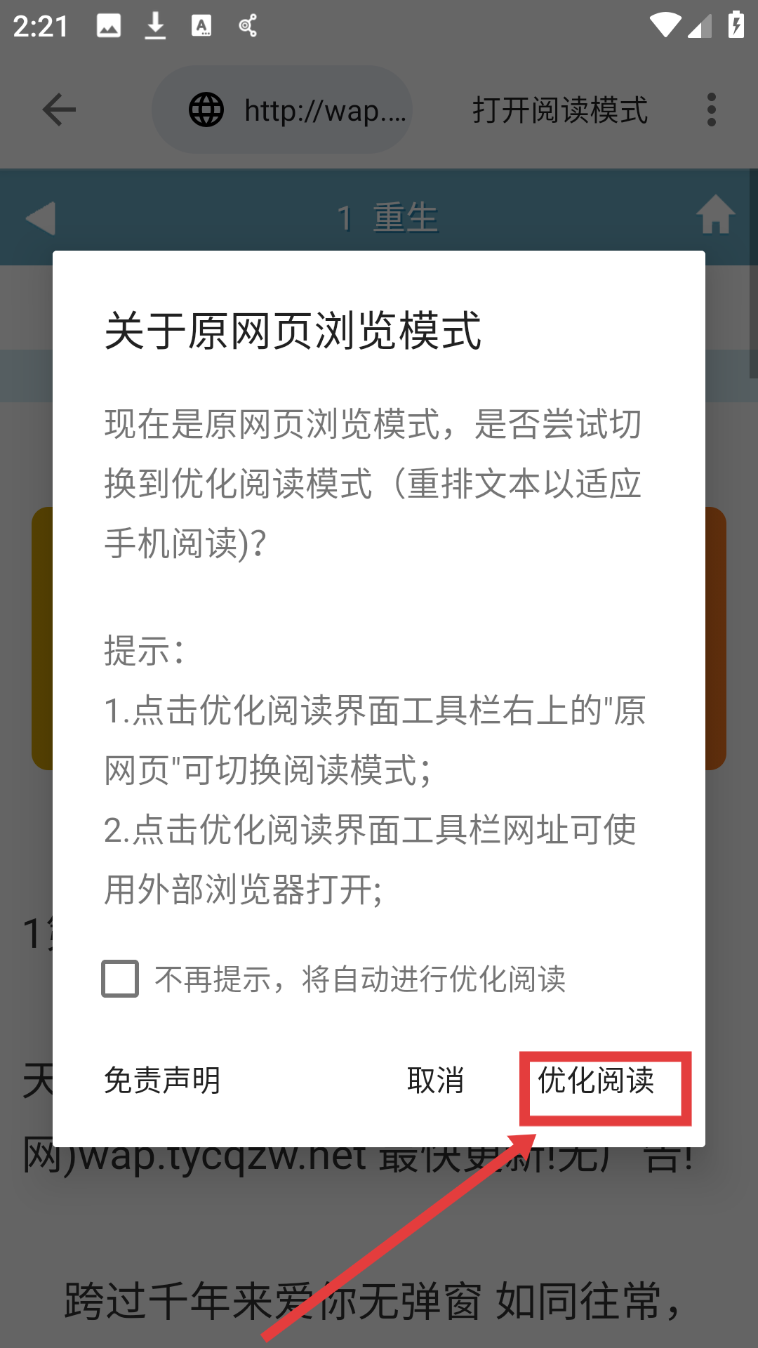 2、进入阅读页面时,会弹出关于原网页浏览模式的提示,点击【优化阅读】,可切换到优化阅读模式哦。